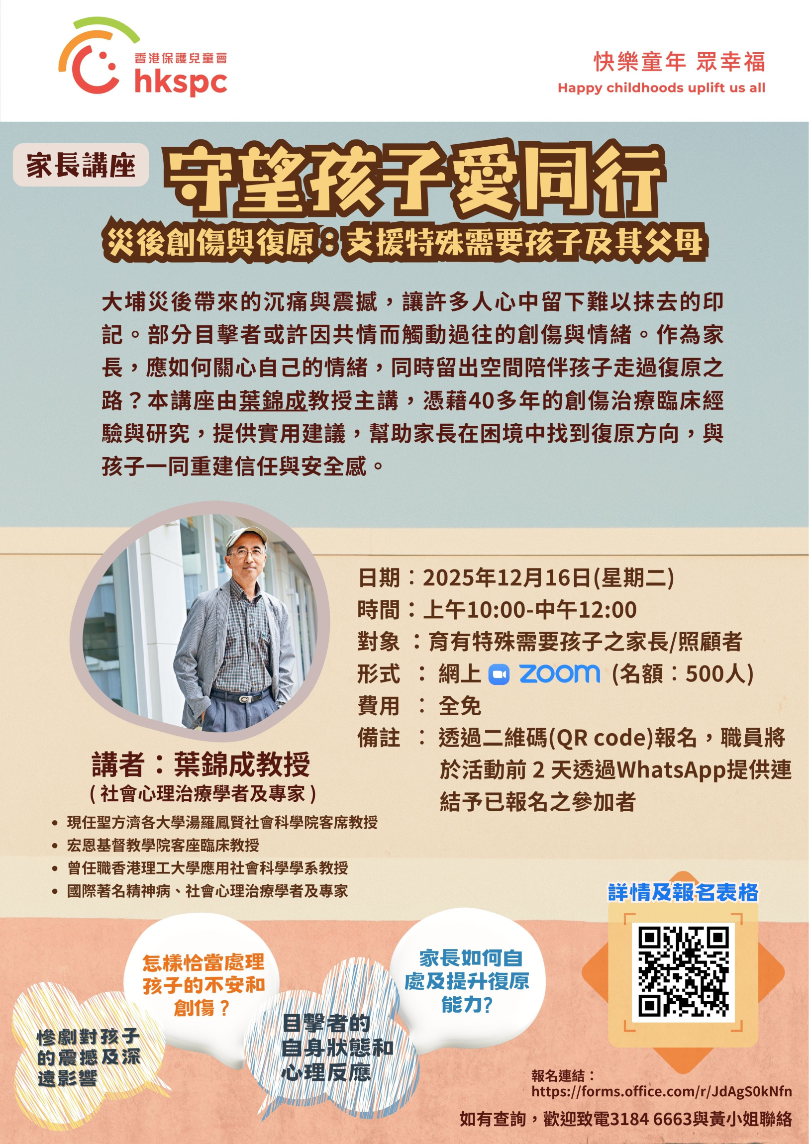 大埔火災在許多人心裡留下深刻痕跡,部分目擊者也有可能觸動過往創傷。家長應如何安頓自己的情緒,以騰出更多心力陪伴孩子?葉錦成教授將提供實用建議,協助家長尋得復原方向,與孩子重建安穩與信任的關係。照顧自己,正是守護孩子的開始。